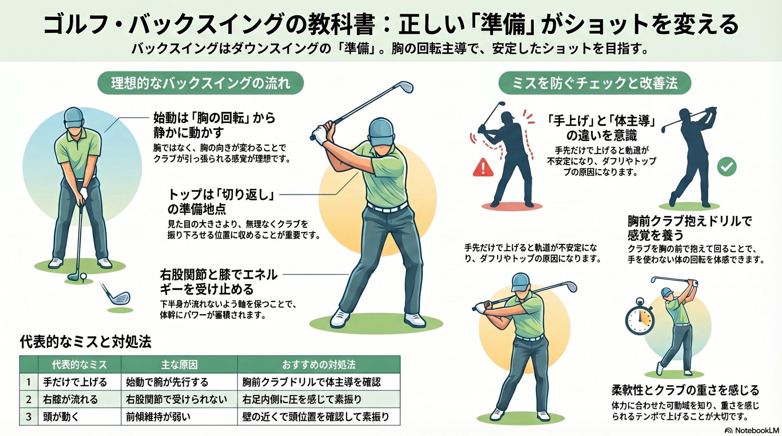 この記事では、ゴルフのバックスイングの目的から、正しい始動、トップの作り方、よくあるミスと原因、手首の使い方、上達につながるドリル、柔軟性チェック、クラブバランスとの関係、初心者向けの考え方まで、実践目線でまとめていきます。読んだあとに、自分の課題がはっきり見えて、次の練習で何を意識すればいいか分かる内容にしています。