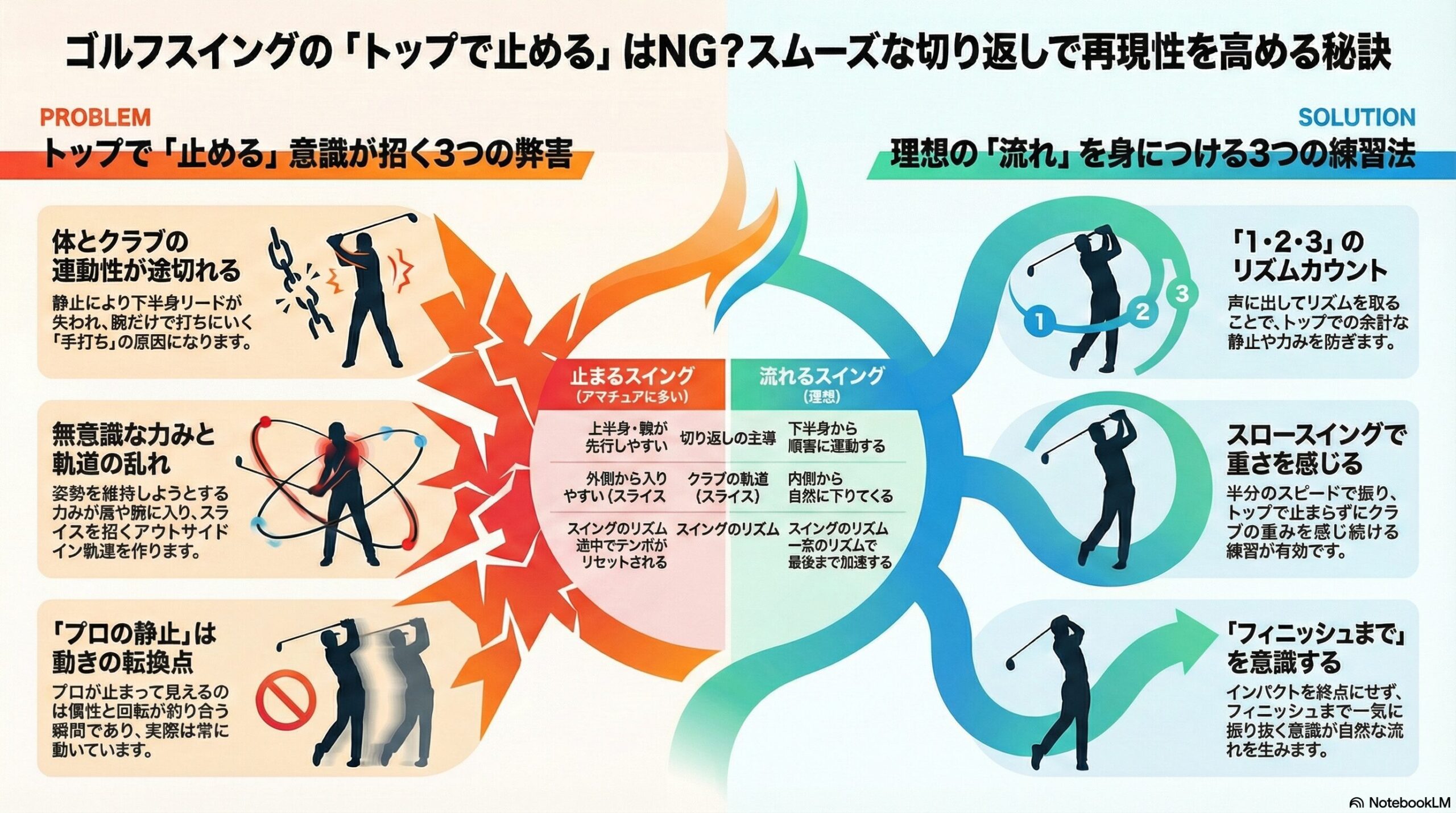こうしたミスはどれもスイングの連動性が弱まることで生じます。トップで止めるクセをなくすことができれば、これらの症状は大幅に改善され、安定したスイングへ近づきます。