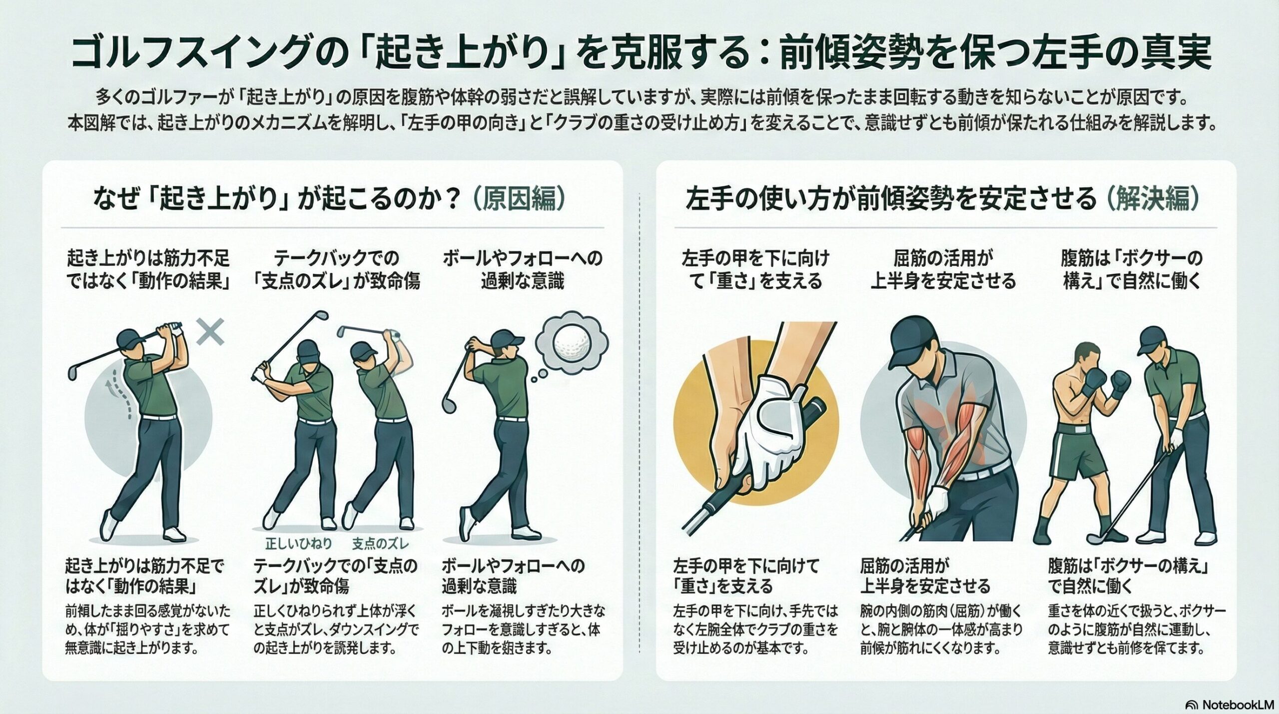 そこで本記事では、起き上がりを単なるミスとして捉えるのではなく、体の使い方の結果として整理し直します。前傾姿勢が崩れる理由を動作の流れから解説し、左手の甲の向きやクラブの重さの受け止め方といった具体的なポイントを通して、無理なく安定したスイングにつなげていきます。
